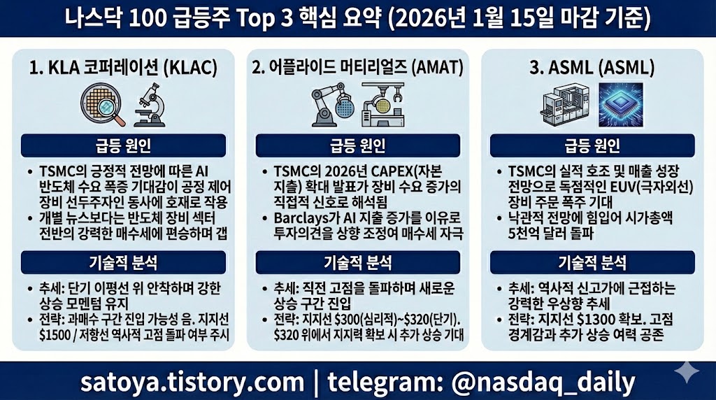 [나스닥 100 일간 급등주 Top 3] KLAC(KLA 코퍼레이션), AMAT(어플라이드 머티리얼즈), ASML(ASML) - AI 반도체 랠리의 주역들, 더 날아오를까?