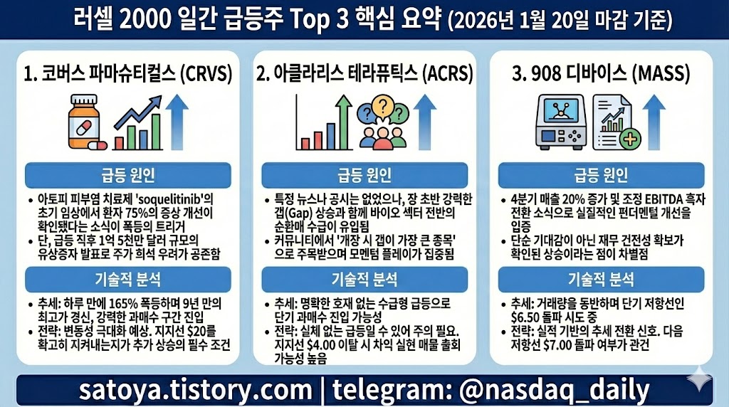 [러셀 2000 일간 급등주 Top 3]CRVS(코버스 파마슈티컬스), ACRS(아클라리스 테라퓨틱스), MASS(908 디바이스)