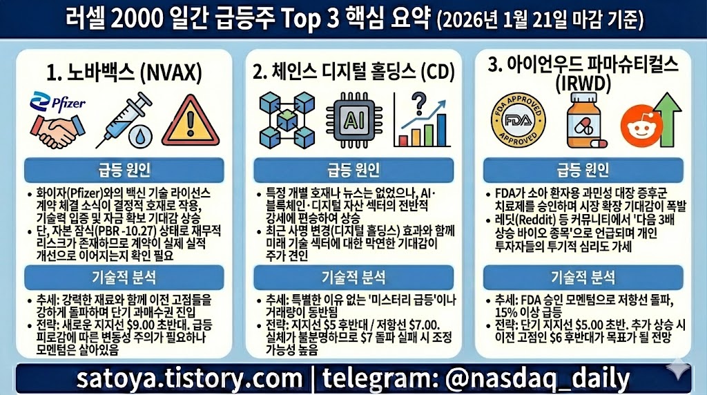 [러셀 2000 일간 급등주 Top 3] NVAX(노바백스), CD(체인스 디지털 홀딩스), IRWD(아이언우드 파마슈티컬스) - 지금 매수 기회를 찾아볼까?