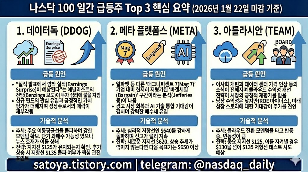 [나스닥 100 일간 급등주 Top 3] DDOG(데이터독), META(메타), TEAM(아틀라시안) - 급등의 배경과 전망은?