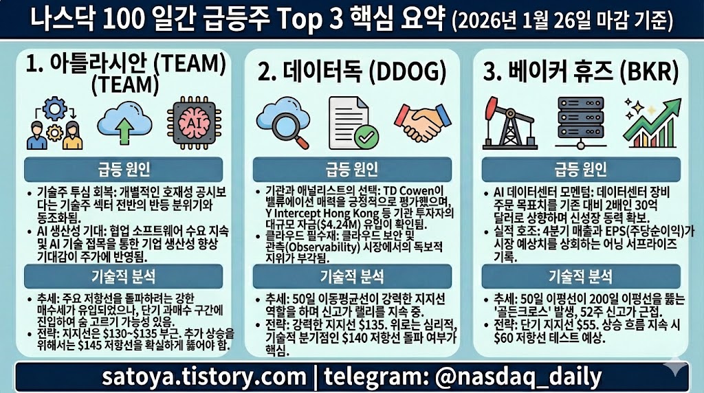 [나스닥 100 일간 급등주 Top 3] TEAM(아틀라시안), DDOG(데이터독), BKR(베이커 휴즈) - 기술주 반등과 에너지 섹터의 약진, 지금 봐야 할 이유!