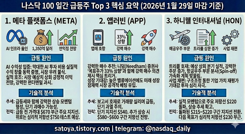 [나스닥 100 일간 급등주 Top 3] META(메타), APP(앱러빈), HON(하니웰) - AI와 실적, 성장동력의 힘찬 비상!